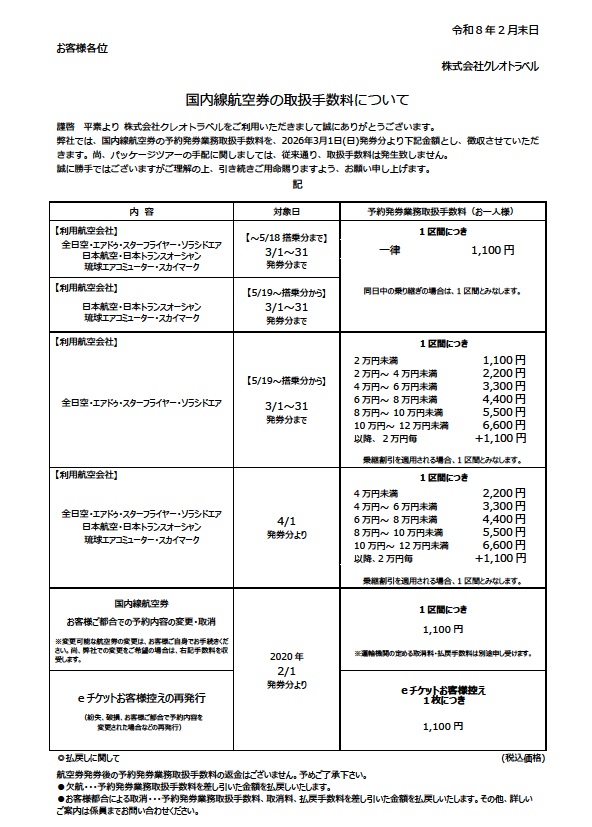 2026年3月1日発券分より、国内航空券の取扱手数料の価格を変更して収受させていただくことになりました。