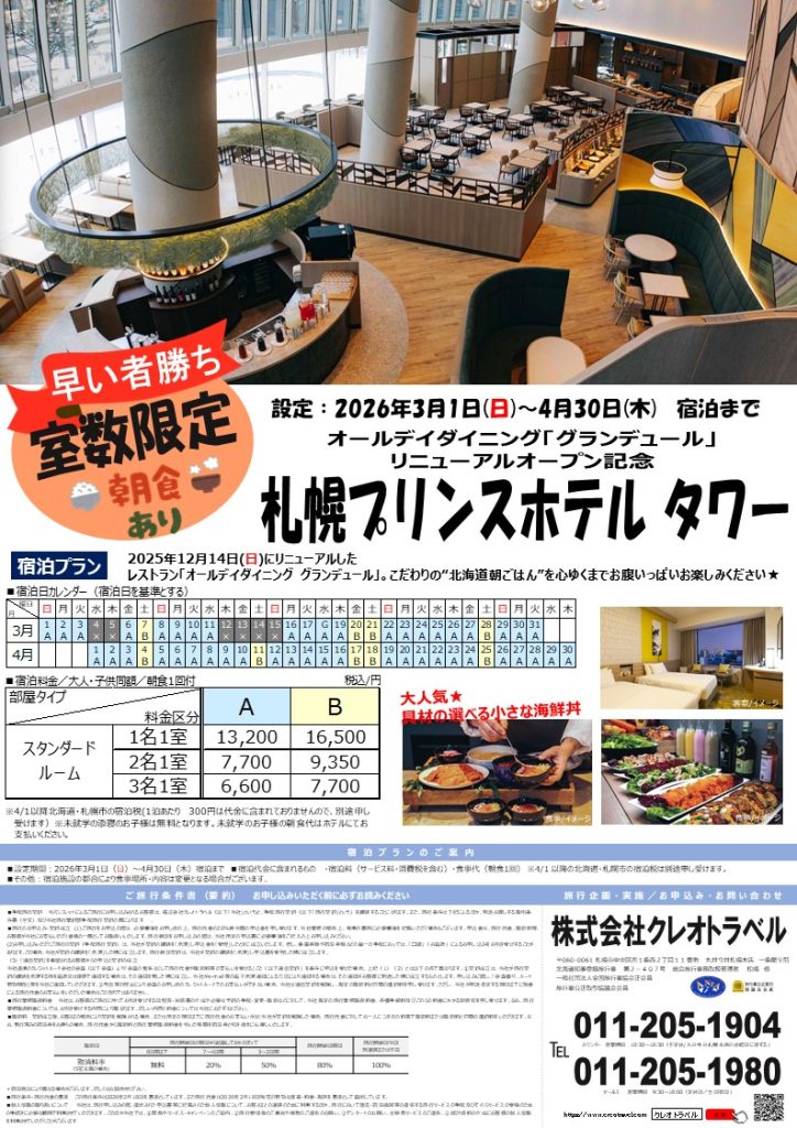 室数限定 札幌プリンスホテルタワー 宿泊プラン
